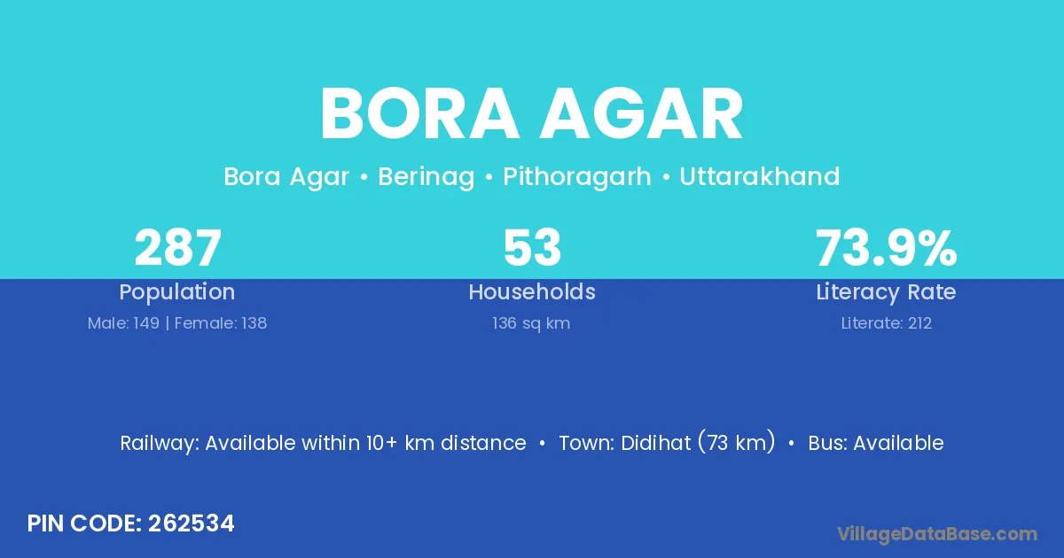 Didihat (73 km) is the nearest town to Bora Agar village for major economic activities and is located approximately 73 km away.