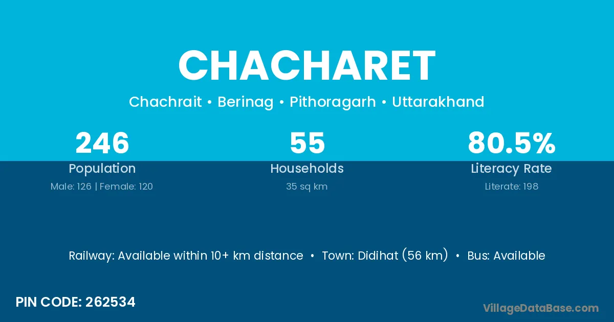Didihat (56 km) is the nearest town to Chacharet village for major economic activities and is located approximately 56 km away.