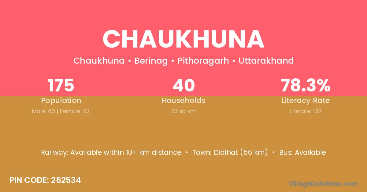 Didihat (56 km) is the nearest town to Chaukhuna village for major economic activities and is located approximately 56 km away.