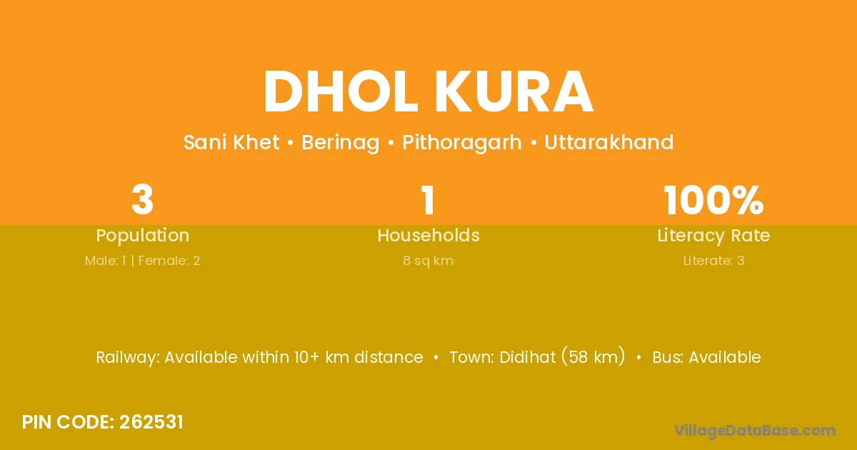 Didihat (58 km) is the nearest town to Dhol Kura village for major economic activities and is located approximately 58 km away.
