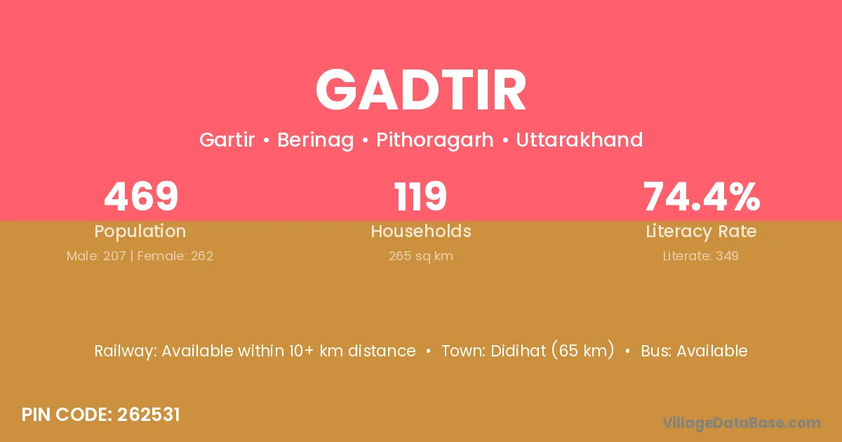 Didihat (65 km) is the nearest town to Gadtir village for major economic activities and is located approximately 65 km away.