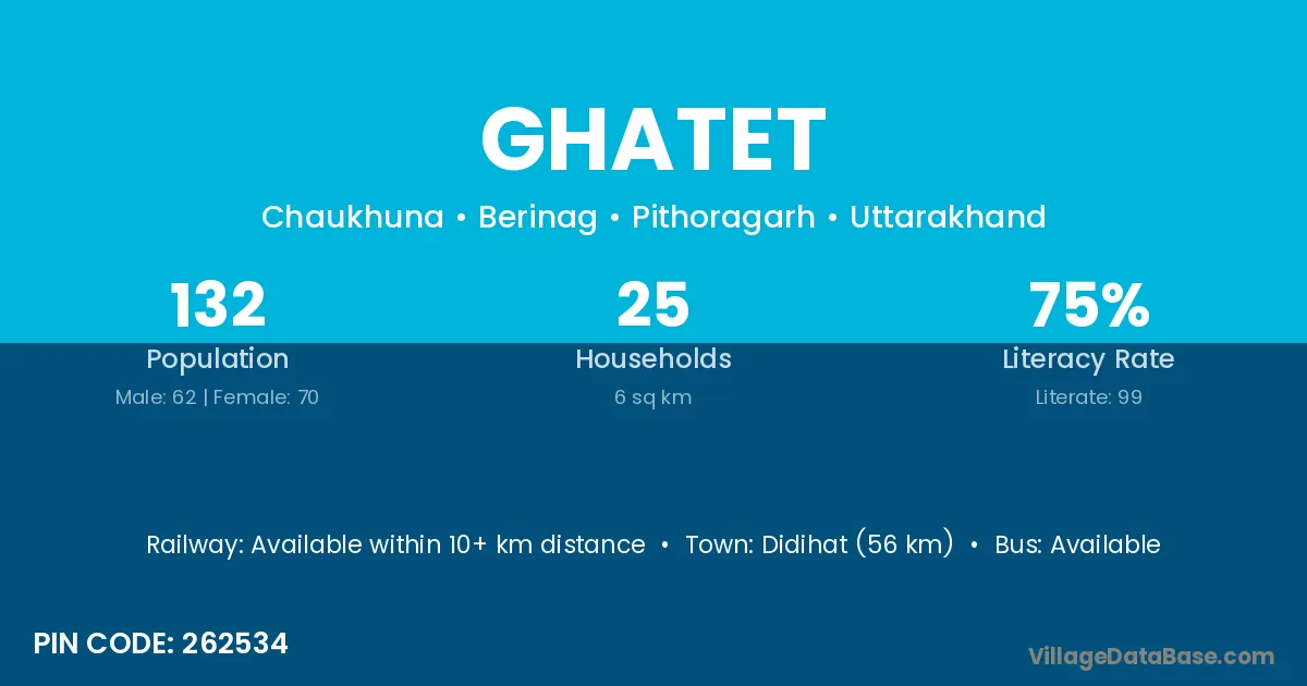 Didihat (56 km) is the nearest town to Ghatet village for major economic activities and is located approximately 56 km away.