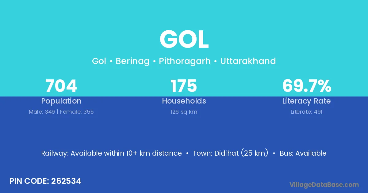 Didihat (25 km) is the nearest town to Gol village for major economic activities and is located approximately 25 km away.