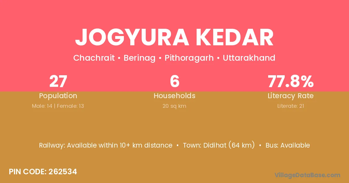 Didihat (64 km) is the nearest town to Jogyura Kedar village for major economic activities and is located approximately 64 km away.