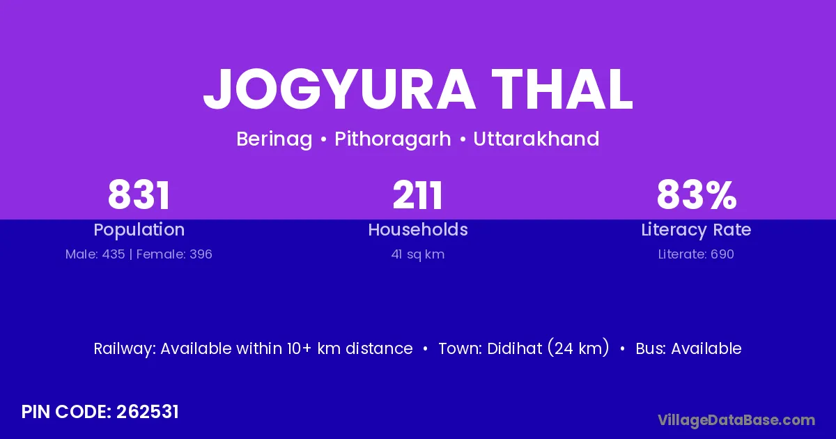 Didihat (24 km) is the nearest town to Jogyura Thal village for major economic activities and is located approximately 24 km away.