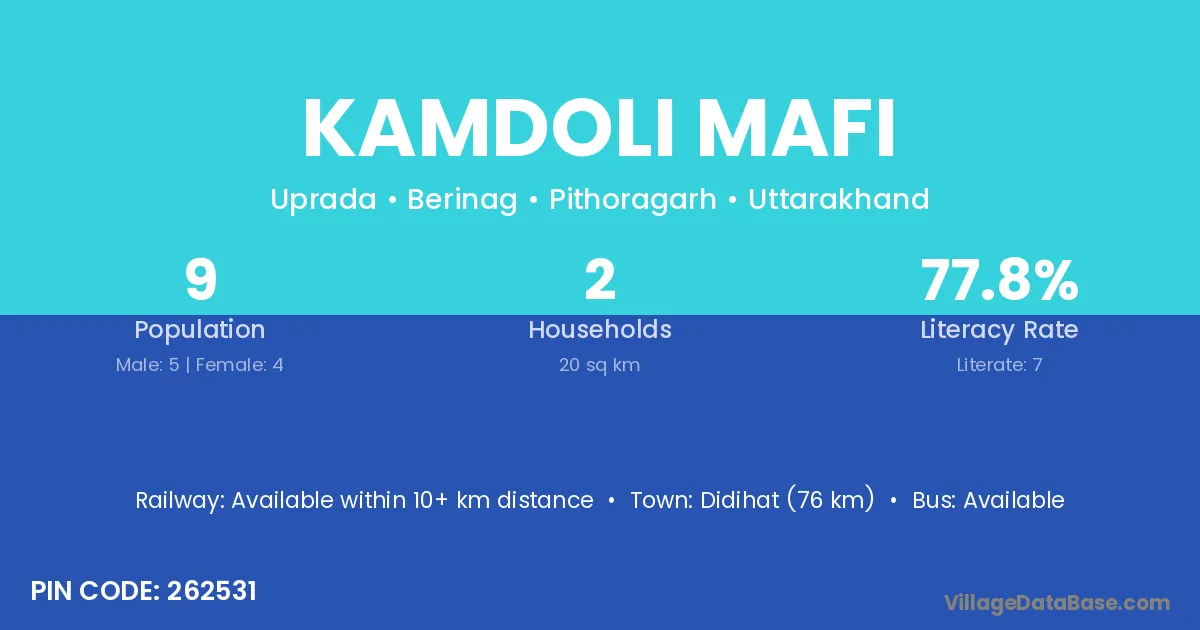 Didihat (76 km) is the nearest town to Kamdoli Mafi village for major economic activities and is located approximately 76 km away.