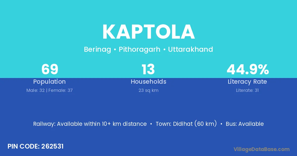 Didihat (60 km) is the nearest town to Kaptola village for major economic activities and is located approximately 60 km away.