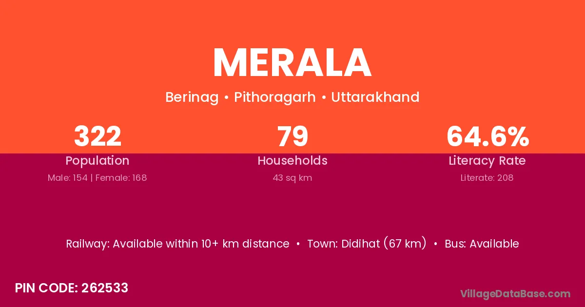 Didihat (67 km) is the nearest town to Merala village for major economic activities and is located approximately 67 km away.
