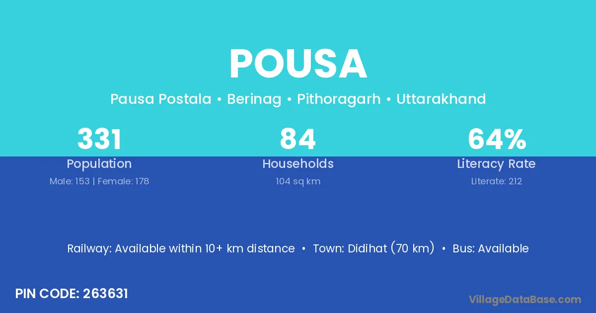 Didihat (70 km) is the nearest town to Pousa village for major economic activities and is located approximately 70 km away.
