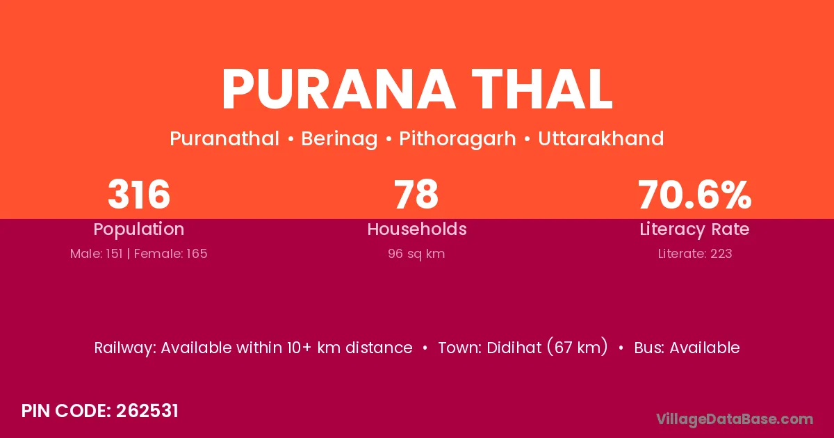 Didihat (67 km) is the nearest town to Purana Thal village for major economic activities and is located approximately 67 km away.