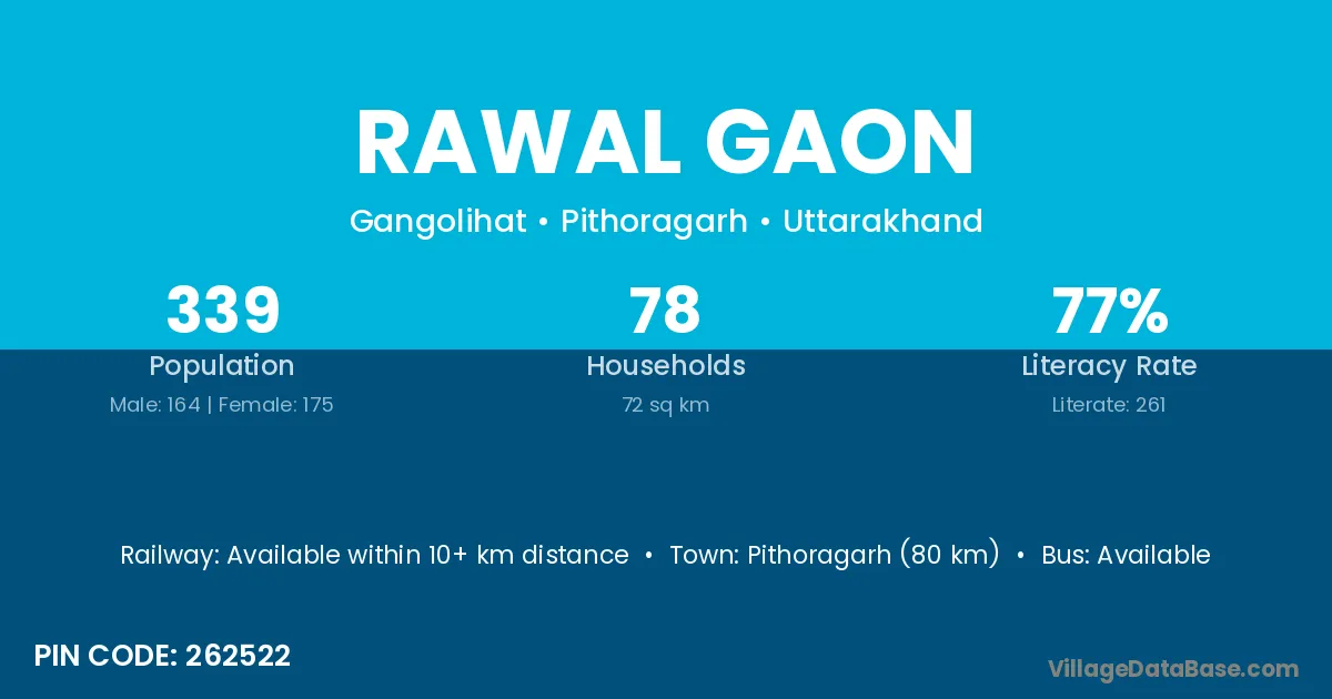 Didihat (62 km) is the nearest town to Rawal Gaon village for major economic activities and is located approximately 62 km away.