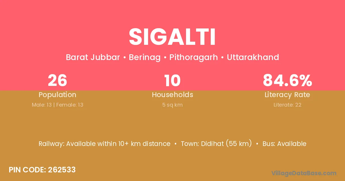 Didihat (55 km) is the nearest town to Sigalti village for major economic activities and is located approximately 55 km away.