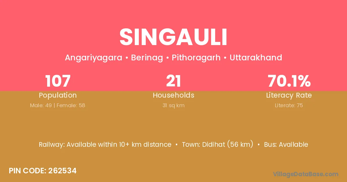 Didihat (56 km) is the nearest town to Singauli village for major economic activities and is located approximately 56 km away.