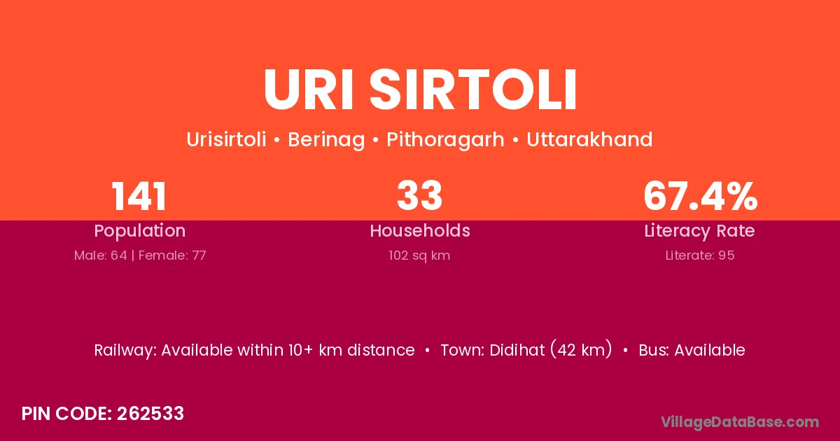 Didihat (42 km) is the nearest town to Uri Sirtoli village for major economic activities and is located approximately 42 km away.