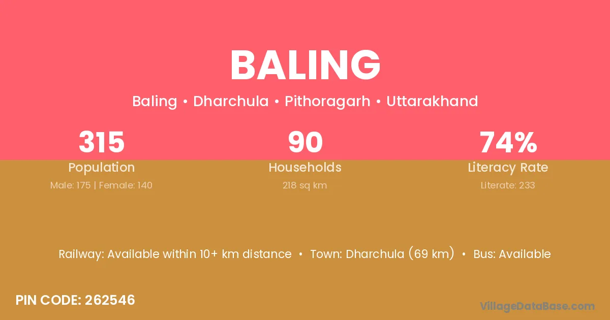Dharchula (69 km) is the nearest town to Baling village for major economic activities and is located approximately 69 km away.