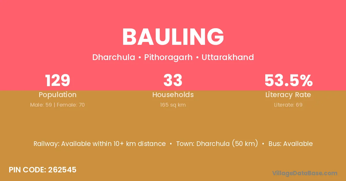 Dharchula (50 km) is the nearest town to Bauling village for major economic activities and is located approximately 50 km away.