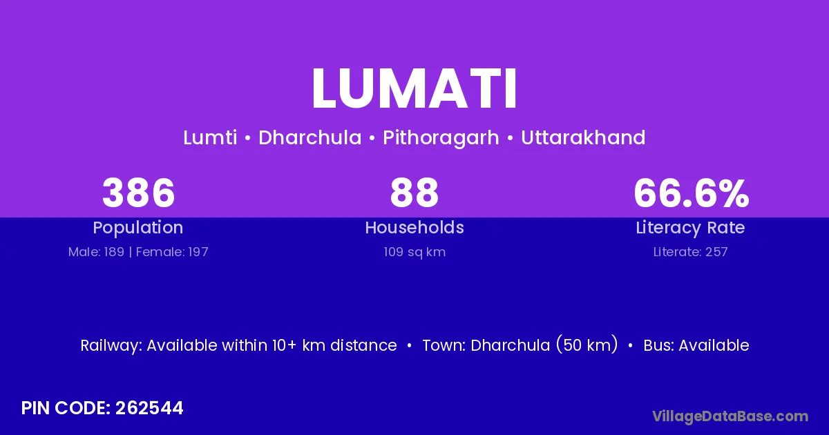 Dharchula (50 km) is the nearest town to Lumati village for major economic activities and is located approximately 50 km away.