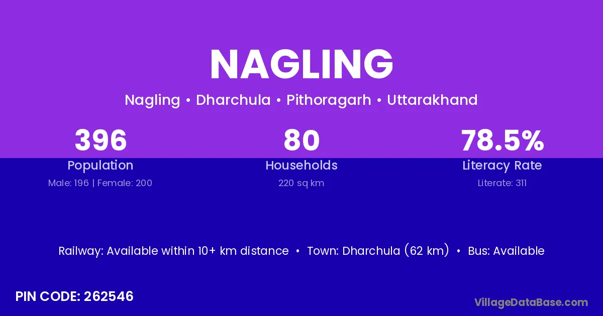 Dharchula (62 km) is the nearest town to Nagling village for major economic activities and is located approximately 62 km away.