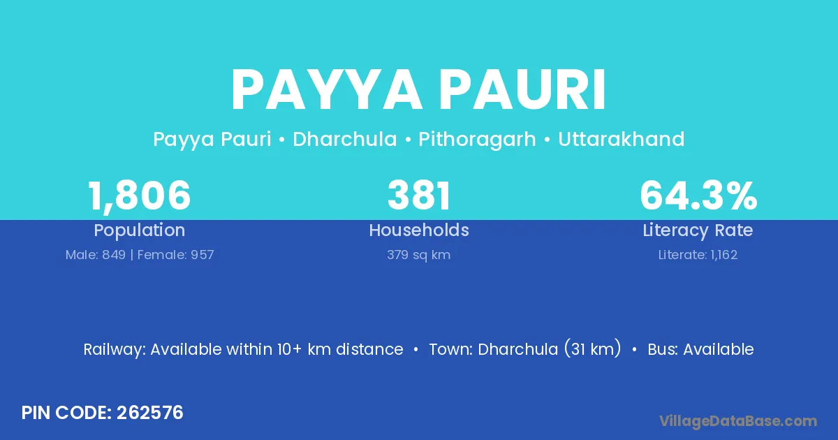 Dharchula (31 km) is the nearest town to Payya Pauri village for major economic activities and is located approximately 31 km away.