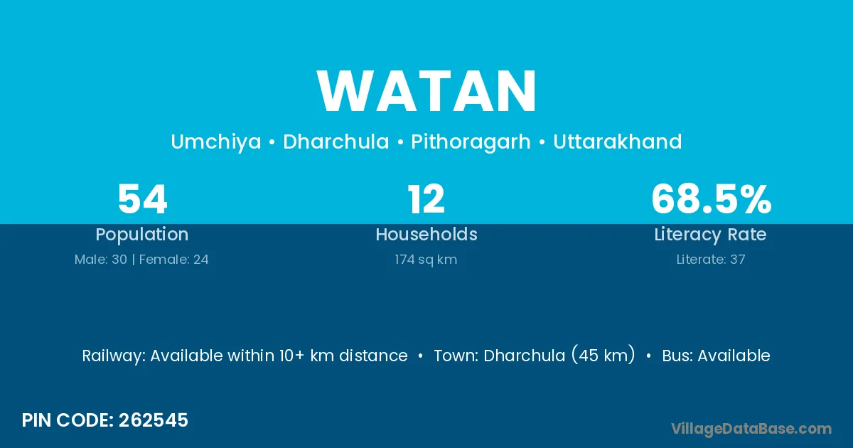 Dharchula (45 km) is the nearest town to Watan village for major economic activities and is located approximately 45 km away.