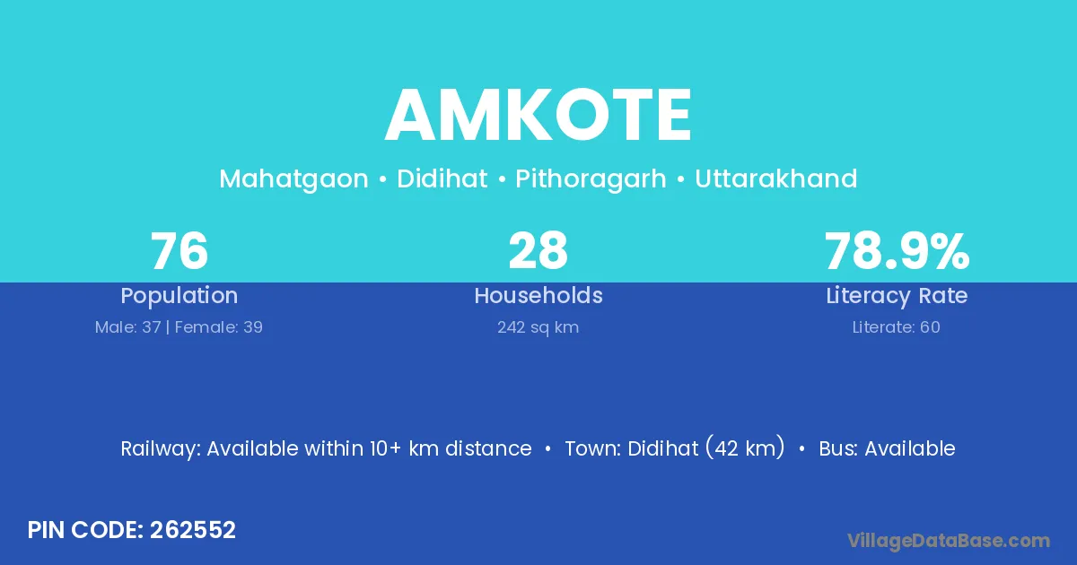 Didihat (42 km) is the nearest town to Amkote village for major economic activities and is located approximately 42 km away.
