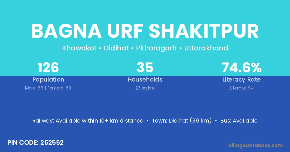 Didihat (39 km) is the nearest town to Bagna Urf Shakitpur village for major economic activities and is located approximately 39 km away.