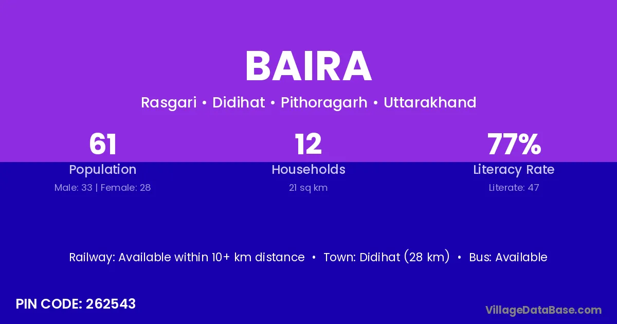 Didihat (28 km) is the nearest town to Baira village for major economic activities and is located approximately 28 km away.