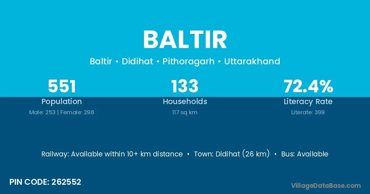 Didihat (26 km) is the nearest town to Baltir village for major economic activities and is located approximately 26 km away.