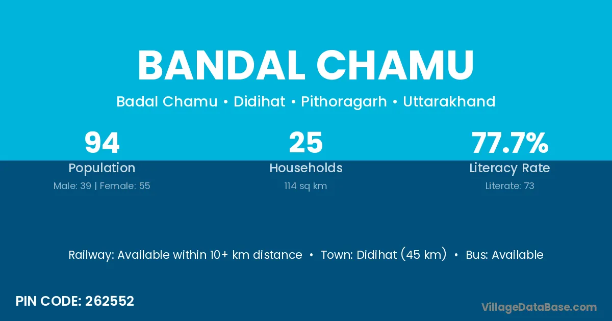 Didihat (45 km) is the nearest town to Bandal Chamu village for major economic activities and is located approximately 45 km away.