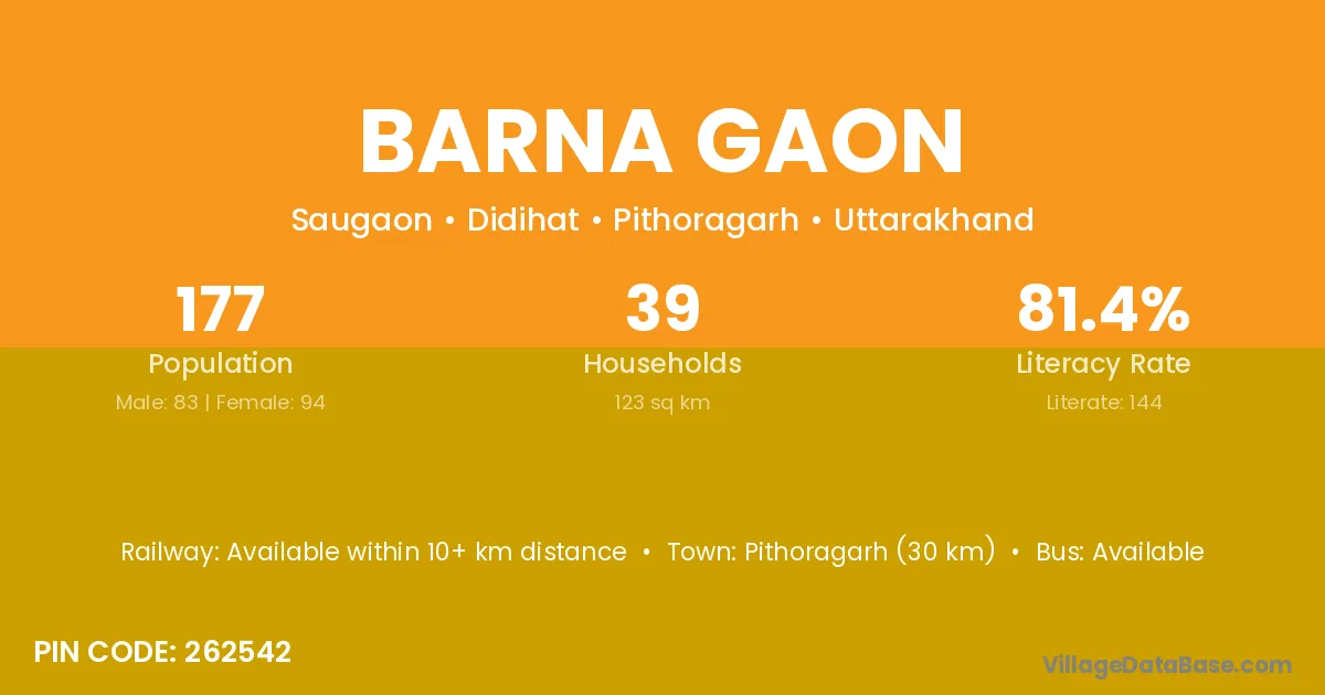 Pithoragarh (30 km) is the nearest town to Barna Gaon village for major economic activities and is located approximately 30 km away.