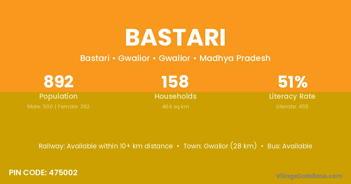 The literacy rate of Bastari village is 65.38%. Male literacy stands at 75.17% and female literacy at 56.44%.