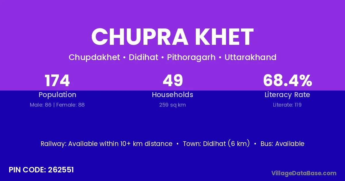 Didihat (6 km) is the nearest town to Chupra Khet village for major economic activities and is located approximately 6 km away.