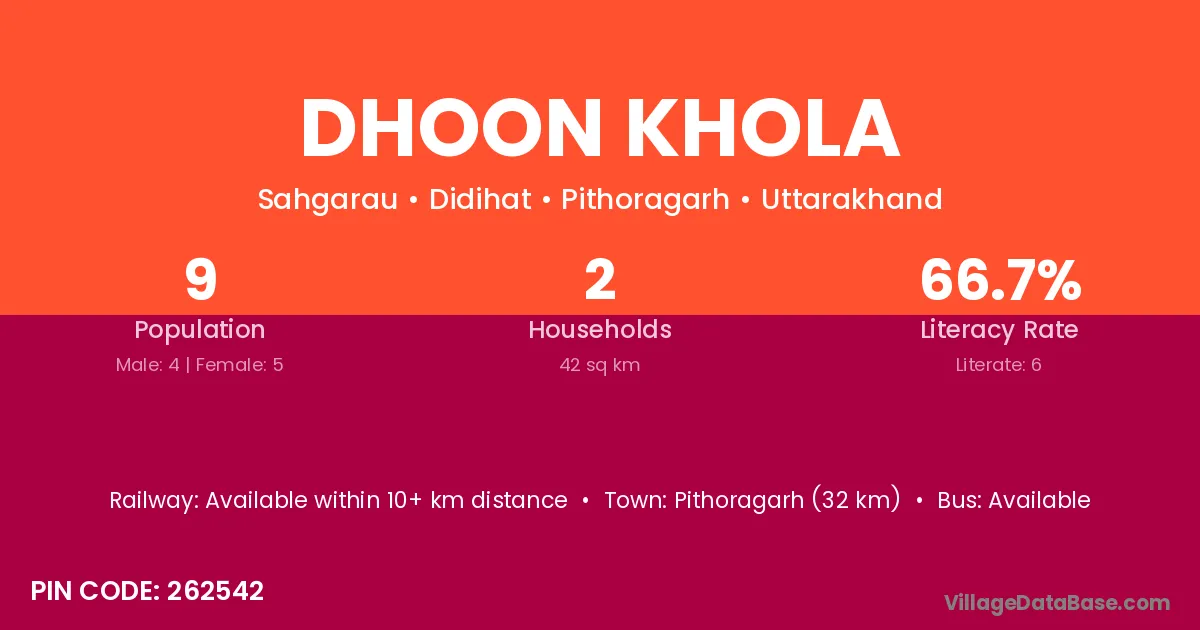 Pithoragarh (32 km) is the nearest town to Dhoon Khola village for major economic activities and is located approximately 32 km away.