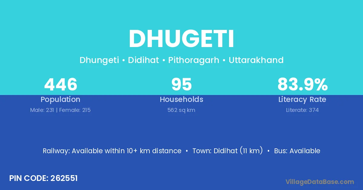 Didihat (11 km) is the nearest town to Dhugeti village for major economic activities and is located approximately 11 km away.