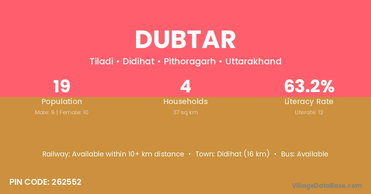 Didihat (16 km) is the nearest town to Dubtar village for major economic activities and is located approximately 16 km away.