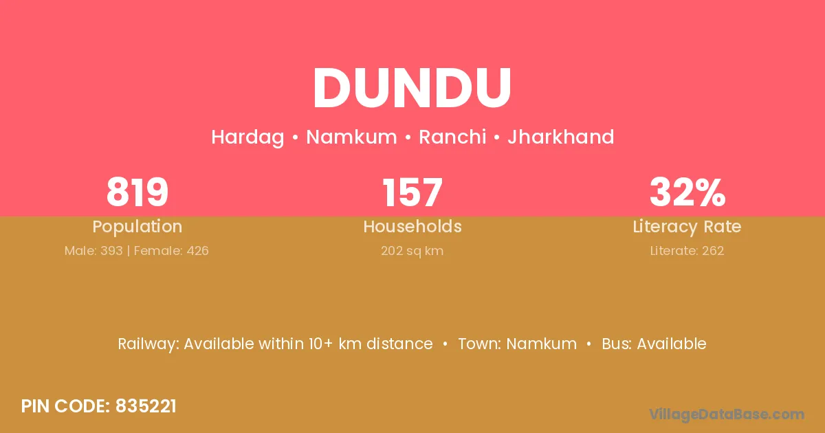 The literacy rate of Dundu village is 68.49%. Male literacy stands at 80.70% and female literacy at 55.24%.