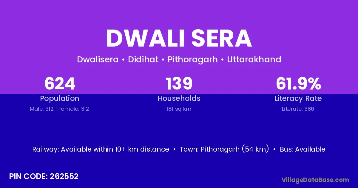 Pithoragarh (54 km) is the nearest town to Dwali Sera village for major economic activities and is located approximately 54 km away.