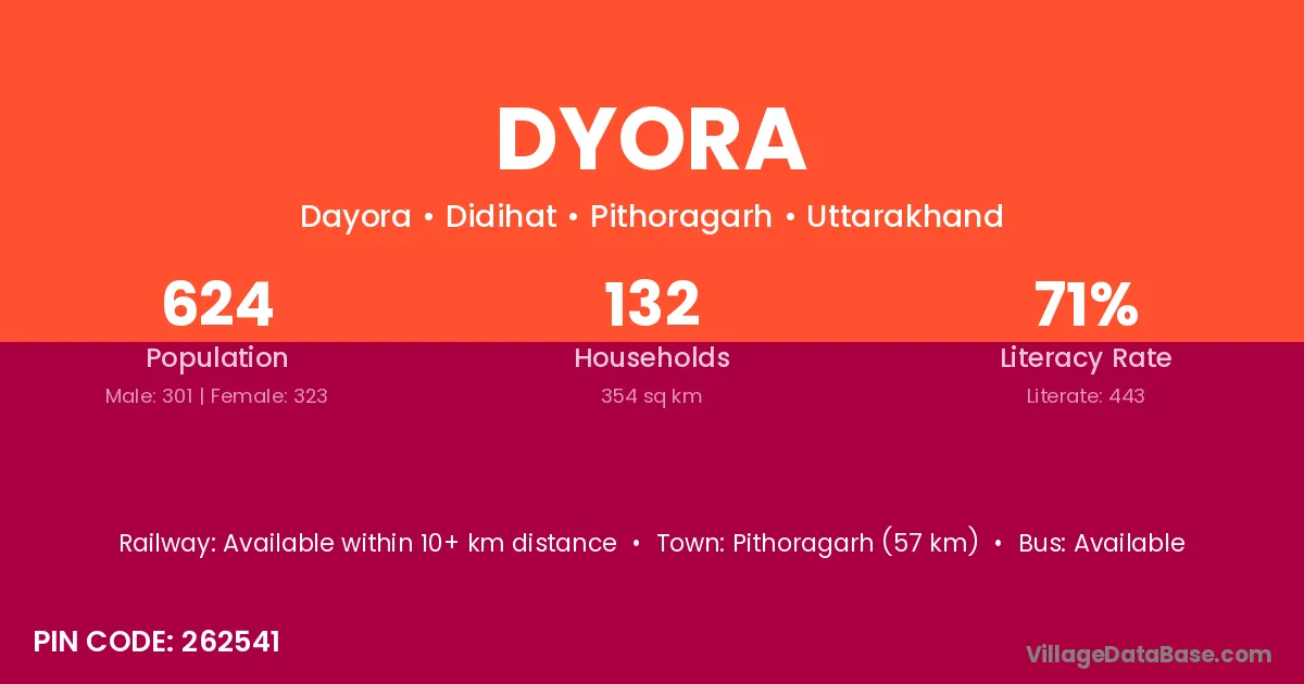 Pithoragarh (57 km) is the nearest town to Dyora village for major economic activities and is located approximately 57 km away.