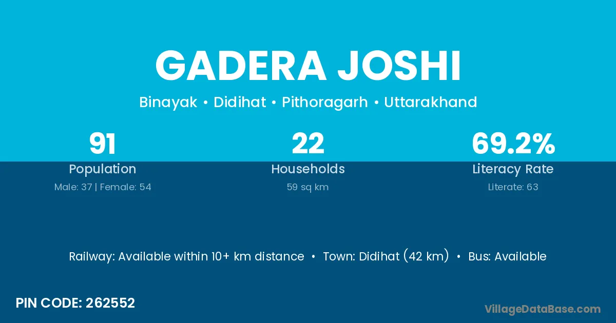 Didihat (42 km) is the nearest town to Gadera Joshi village for major economic activities and is located approximately 42 km away.