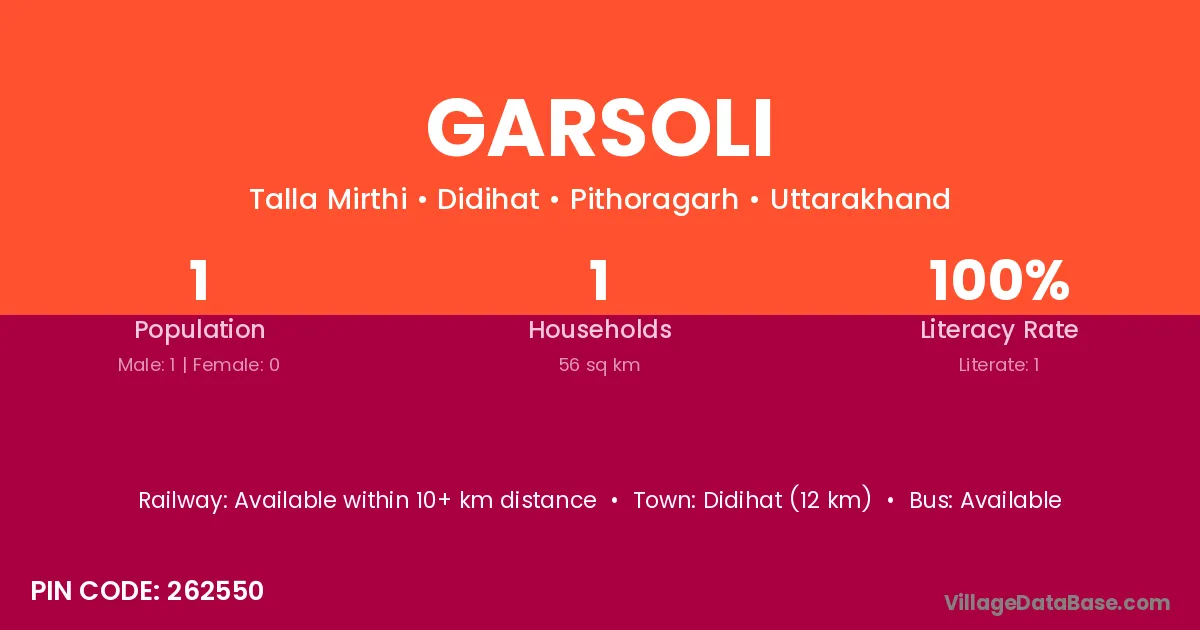 Didihat (12 km) is the nearest town to Garsoli village for major economic activities and is located approximately 12 km away.