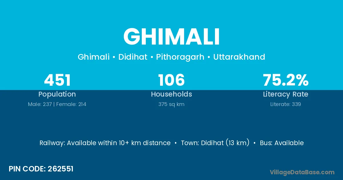 Didihat (13 km) is the nearest town to Ghimali village for major economic activities and is located approximately 13 km away.