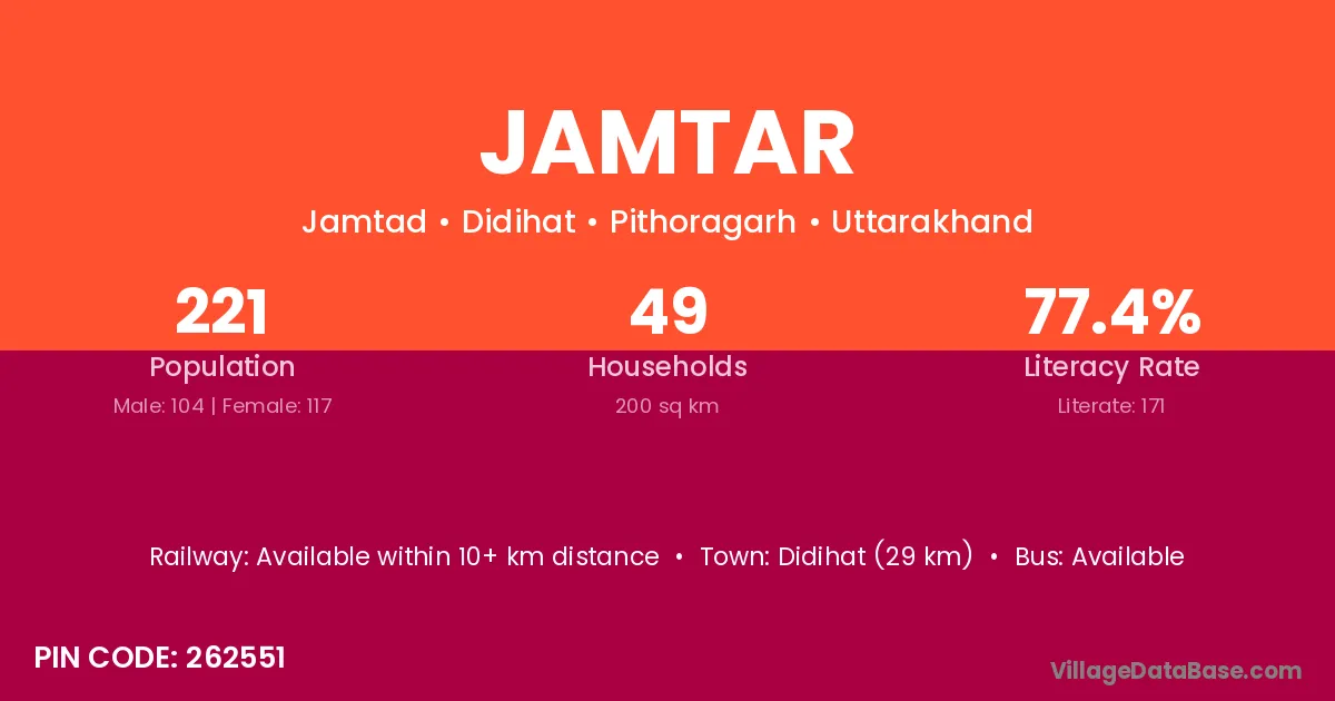 Didihat (29 km) is the nearest town to Jamtar village for major economic activities and is located approximately 29 km away.