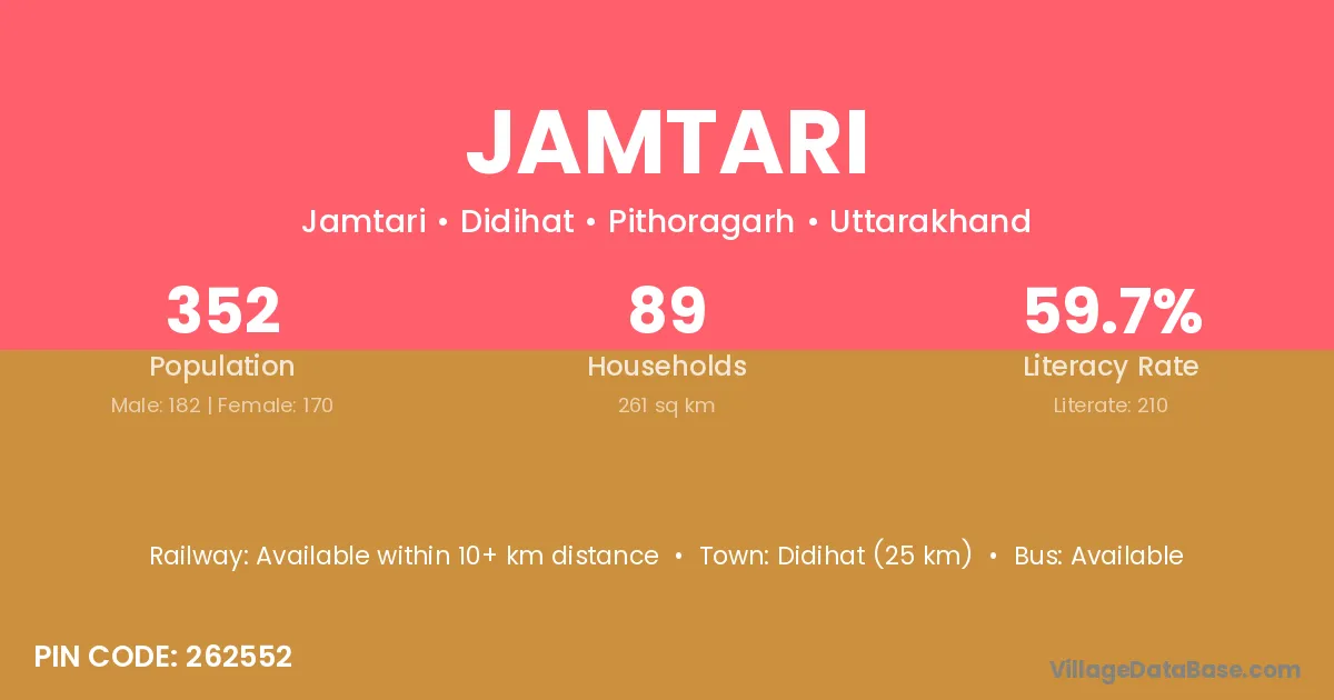 Didihat (25 km) is the nearest town to Jamtari village for major economic activities and is located approximately 25 km away.