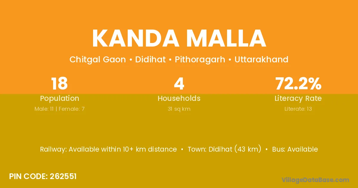 Kanda Malla village has a total population of 18 people, of which 11 are males and 7 are females.