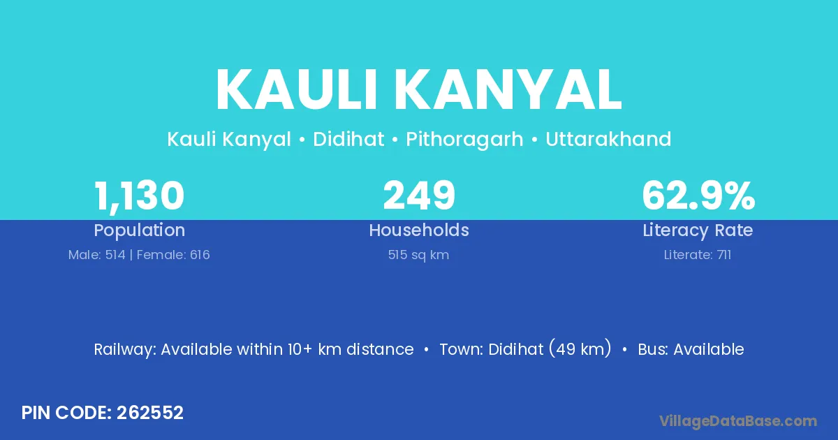 Didihat (49 km) is the nearest town to Kauli Kanyal village for major economic activities and is located approximately 49 km away.