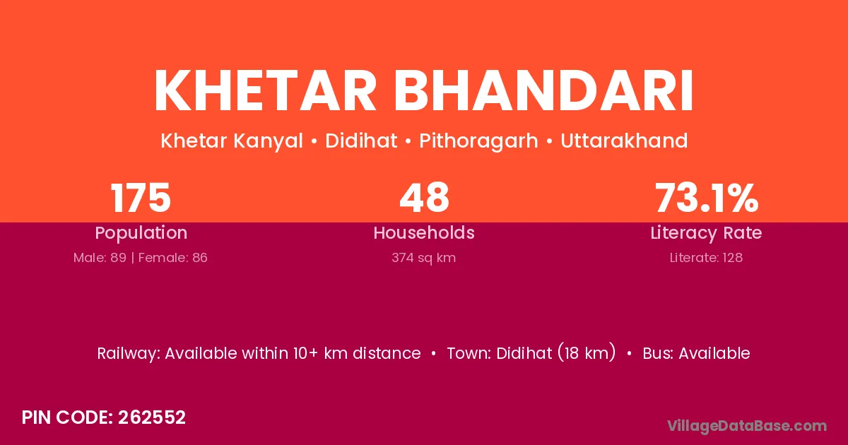 Didihat (18 km) is the nearest town to Khetar Bhandari village for major economic activities and is located approximately 18 km away.