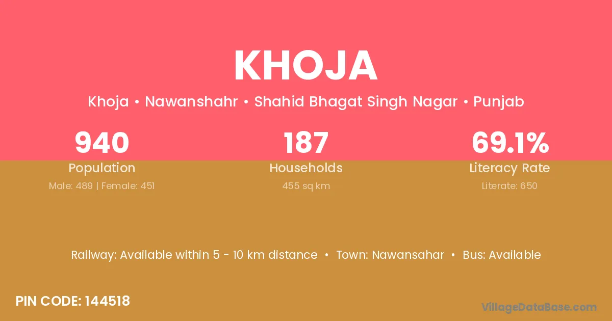 The literacy rate of Khoja village is 70.37%. Male literacy stands at 82.81% and female literacy at 59.15%.