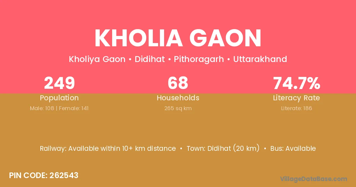 Didihat (20 km) is the nearest town to Kholia Gaon village for major economic activities and is located approximately 20 km away.
