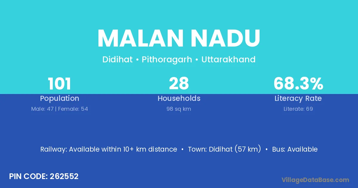 Didihat (57 km) is the nearest town to Malan Nadu village for major economic activities and is located approximately 57 km away.
