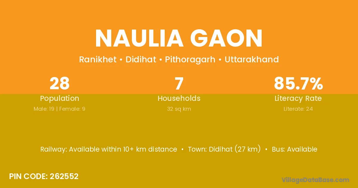 Didihat (27 km) is the nearest town to Naulia Gaon village for major economic activities and is located approximately 27 km away.